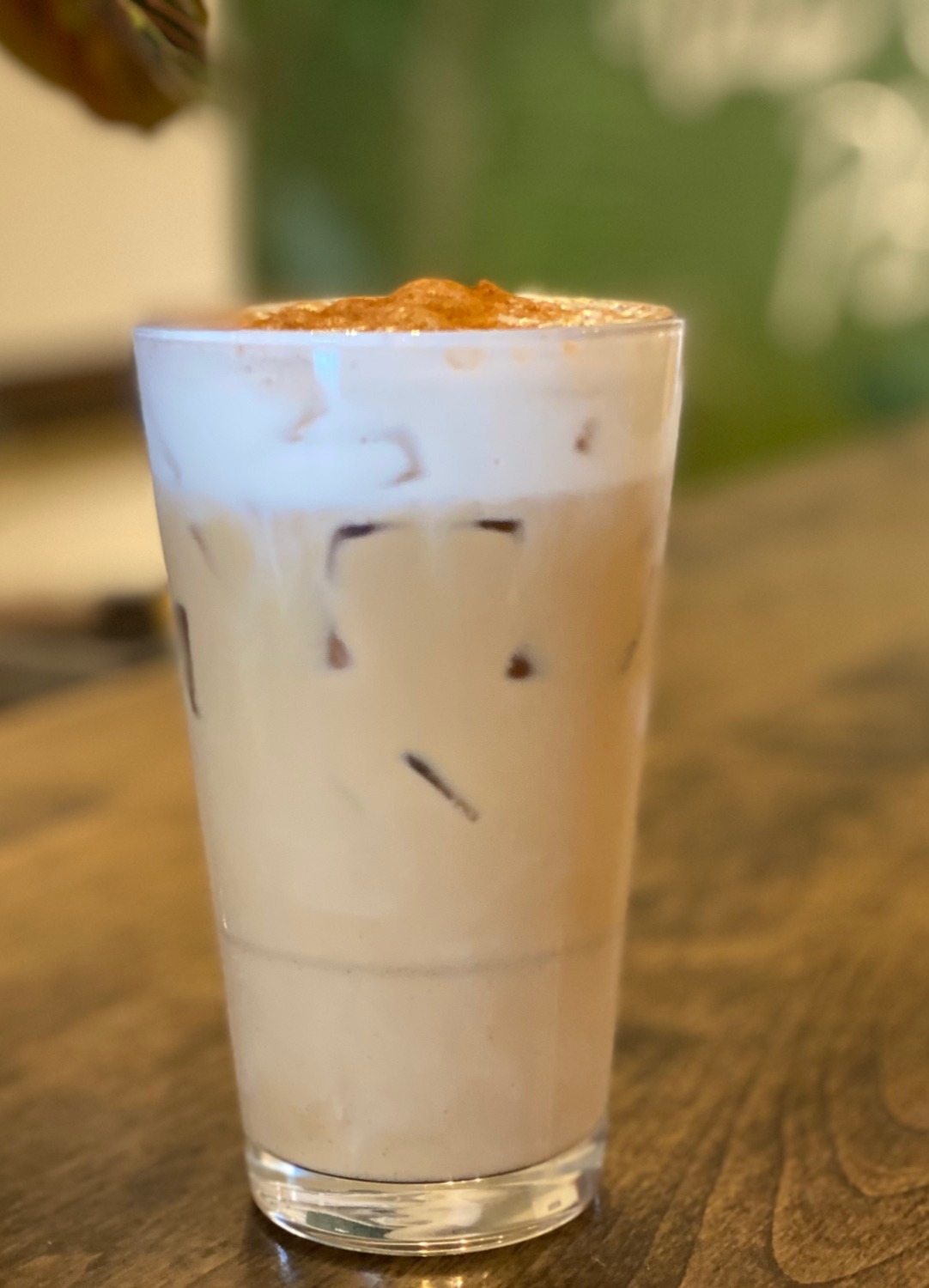 Iced Latte topped with a light and frothy vanilla cold foam and a generous cinnamon dusting.