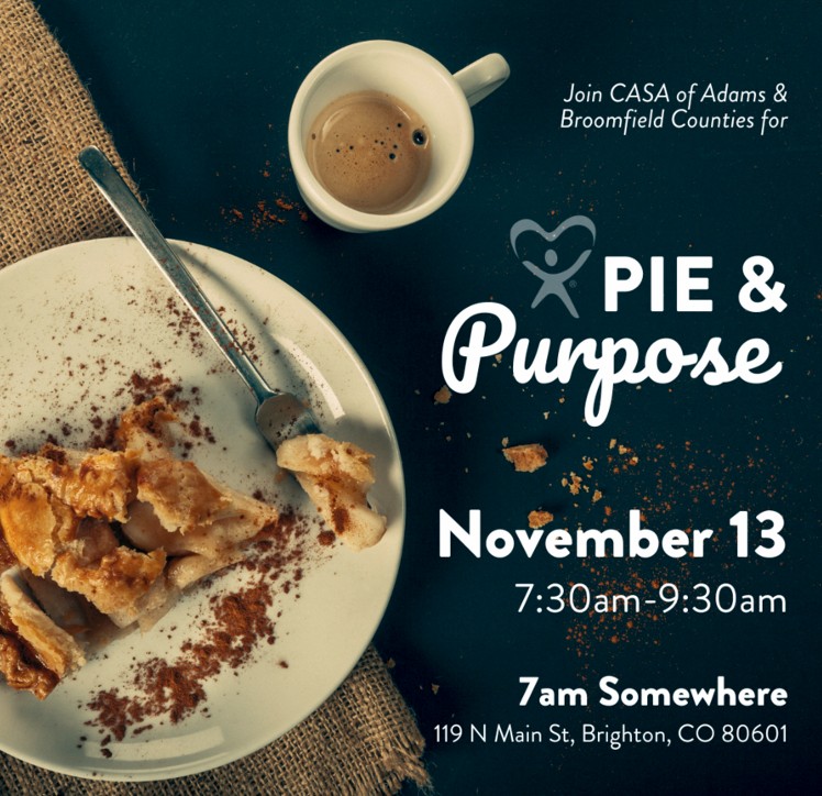 Join us for a cozy morning of connection, coffee, and community impact with CASA of Adams & Broomfield Counties. Enjoy complimentary pie, meaningful conversation, and learn how you can support local children through CASA's mission. 10% off of your drink purchase during event.